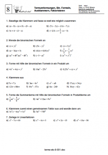 Aufgabenblatt / Klassenarbeit Binomische Formeln, Ausklammern, binomische Formeln rückwärts, Faktorisieren (Satz von Vieta)