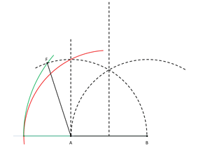 Nun zeichne eine Senkrechte Linie auf den linken Endpunkt der Strecke. (Ohne Geodreieck kann diese Senkrechte als Mittelsenkrechte konstruiert werden). Markiere den Schnittpunkt C dieser Senkrechten mit dem Kreisbogen.