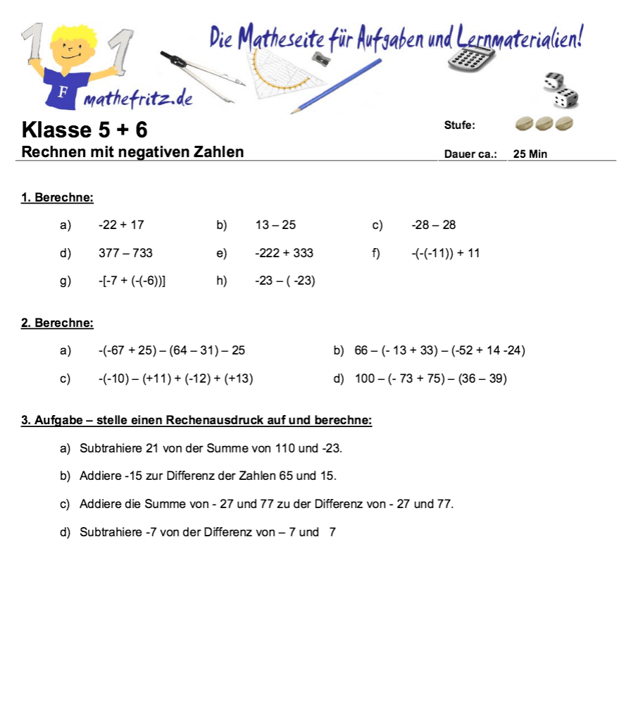 3 Arbeitsblätter zum Thema Rechnen mit negativen Zahlen